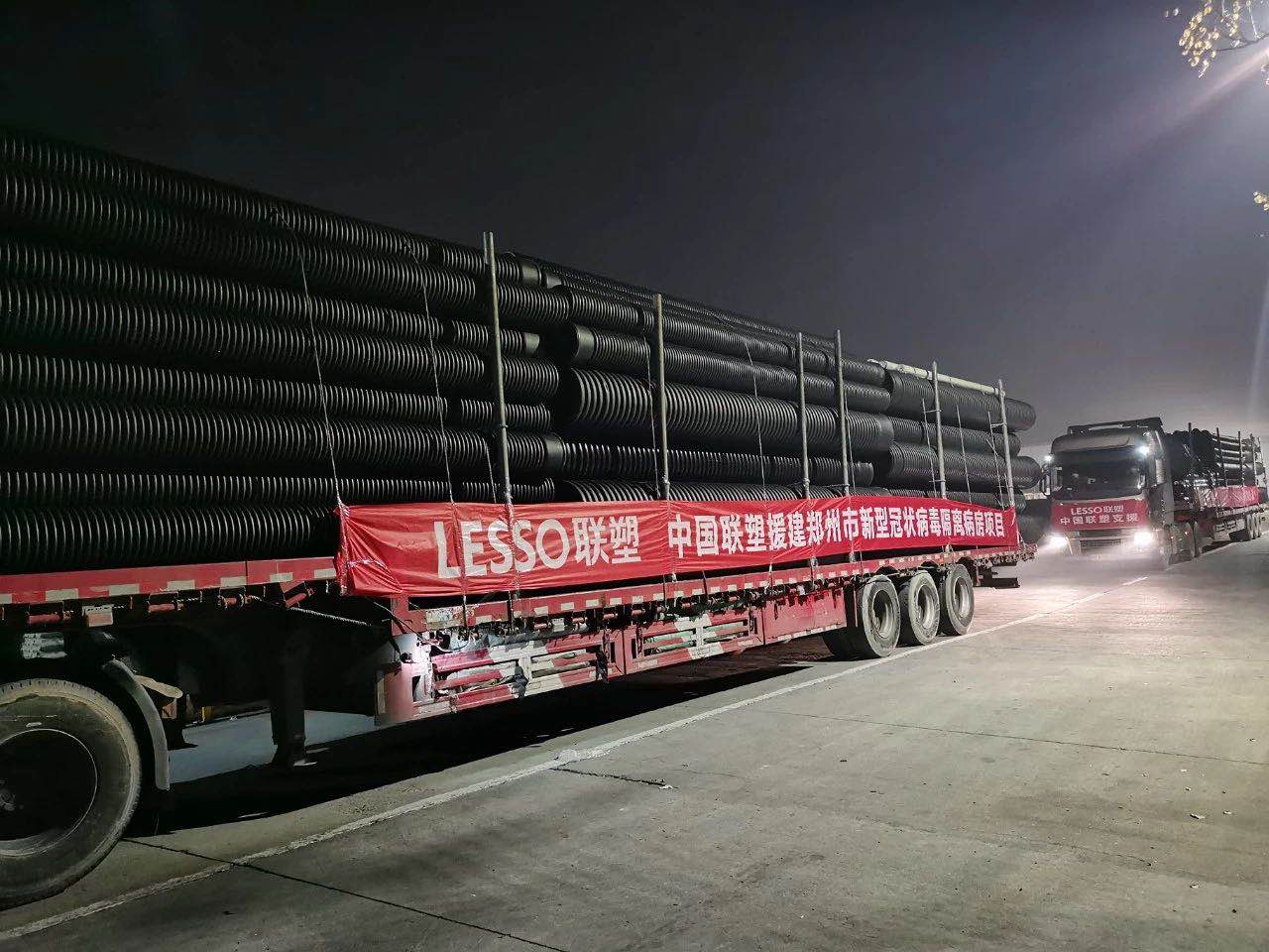 現所有建設所需管道已被火速裝車,運送至鄭州“小湯山”醫院施工現場。中國聯塑責無旁貸為其提供所有材料物資及相關服務,力爭以最快的速度完成任務,順利驗收交付使用。