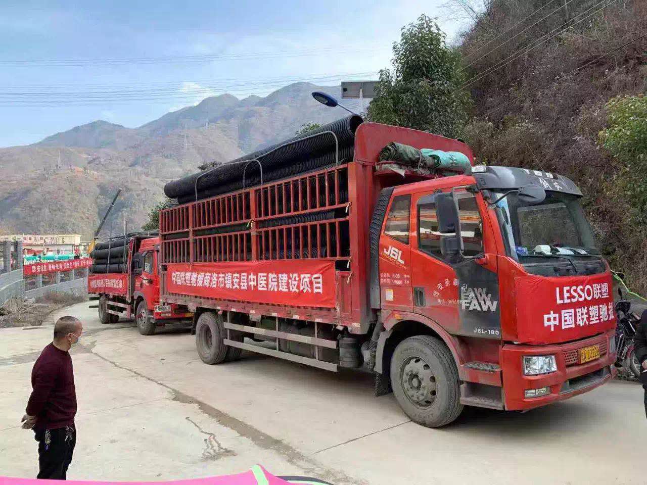 與此同時,陜西商洛市鎮安縣中醫院也發出了應對新型冠狀病毒感染肺炎疫情傳染病區建設項目的應急需求,中國聯塑下屬陜西聯塑公司義不容辭,兵分兩路,分成2個小組,火速從西安公司調配項目工程建設所需的HDPE雙壁波紋管及配件,長達582米,并給與技術支持。